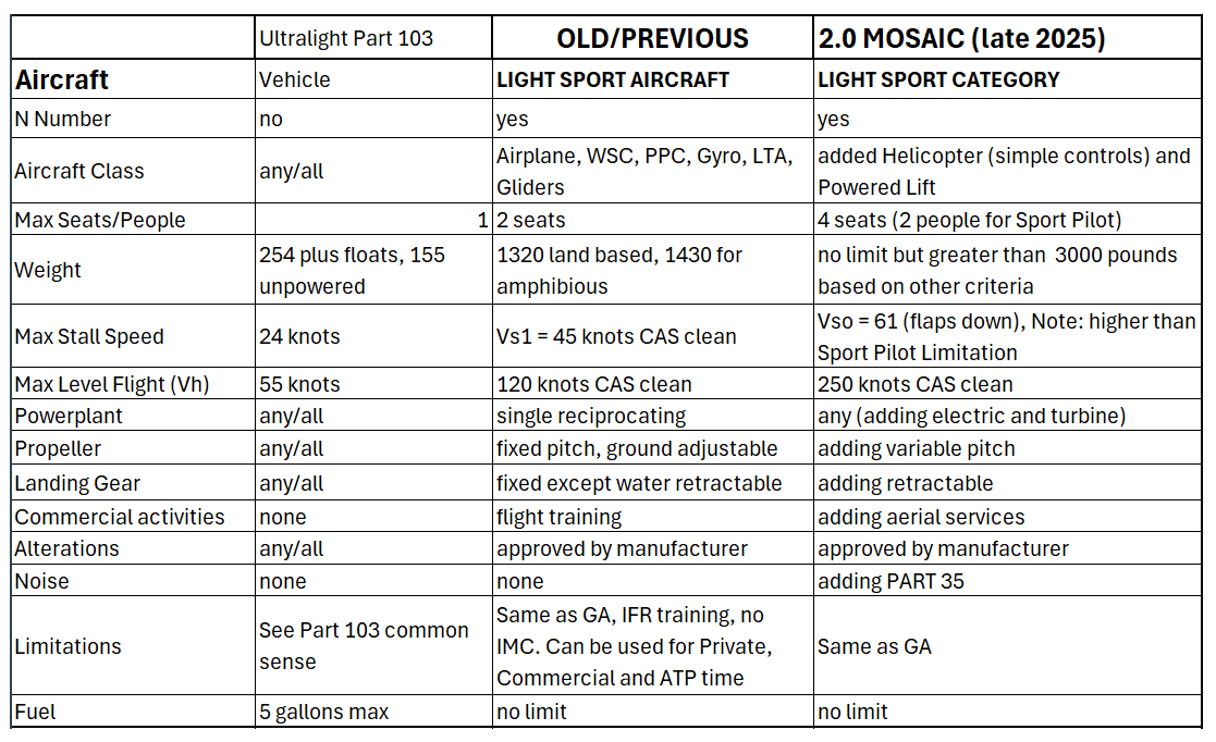MOSAIC (Modernization of Special Airworthiness Certification) or Sport Pilot/Light Sport Category Aircraft 2.0 – Now we have Sport Pilot/Light Sport Category for the period beginning October 22, 2025.